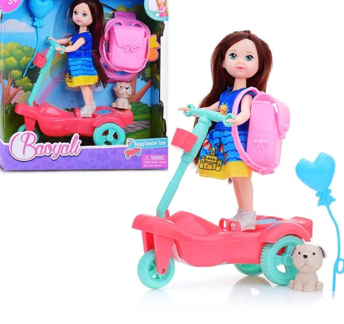 Poupée avec trottinette et petit chien
